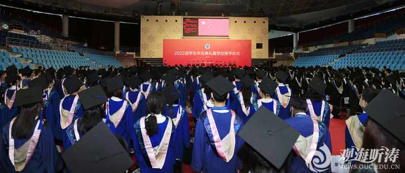 本站讯校园芳草青青,枝枝叶叶离情。根据疫情防控常态化的要求,由学校统一协调安排,以学部、各学院(中心)为单位具体组织落实,于6月14日至16日分别在崂山校区、鱼山校区4个场地,分学部、学院(中心)举办了21场毕业典礼暨学位授予仪式,共计7929名毕业生参加。学校党委书记田辉、校长于志刚通过视频的形式寄语本届毕业生。田辉书记(左)、于志刚校长通过视频的形式寄语2022届毕业生田辉在寄语中以“六实”勉励毕业生。他希望大家踔厉奋发启新程,笃行不怠向未来,对党忠实、为人诚实、学识扎实、干事踏实、作风朴实、进取求实,在实现中华民族伟大复兴的历史进程中谱写无愧于时代,无愧于人民的绚丽篇章。母校永远是大家温暖的家园、坚强的后盾,欢迎同学们常回家看看!于志刚嘱咐毕业生三件事:一是要记得每天读书,静心思考,汲取智慧;二是要记得每天运动,强健体魄,愉悦身心;三是要记得责任使命,发展自我,服务社会。希望大家坚持终身学习,保持独立思考,持续艰苦奋斗。把个人理想和民族复兴的伟大事业更加紧密地结合起来,为中国更加美好的未来做出中国海大人应有的贡献。典礼仪式上,有关领导宣读了《关于授予博士学位、硕士学位和学士学位的