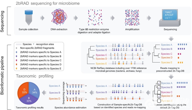 • 本站讯1月26日,中国海洋大学海洋生物遗传学与育种教育部重点实验室包振民院士和王师教授团队与中科院青岛生物能源与过程所徐健研究员团队合作,在国际基因组学领域权威期刊Genome Biology上发表了最新研究成果“Species-resolved sequencing of low-biomass or degraded microbiomes using 2bRAD-M” (种阶元解析精度的微量或降解微生物宏基因组测序技术—2bRAD-M)。微生物组(microbiome)分析作为可获取生物体或环境全部微生物种类和丰度信息的核心技术手段,已在医药、环境、农业、水产等领域被广泛使用并展现出重要的应用潜力。当前,解析微生物群落的物种构成主要依赖于两种高通量研究技术:扩增子测序(16S/18S/ITS)和鸟枪法宏基因组测序(WMS)。然而目前主流的两种技术手段都存在一定的瓶颈问题。传统的扩增子测序技术虽适用于微量样本分析,但存在偏好性高、分辨率低等问题,而且无法同时检测细菌、真菌、古菌。鸟枪法宏基因组测序虽能实现全基因组精度解析,但其测序成本颇高、且难以应用于微量、高度降解样本。因此,亟待