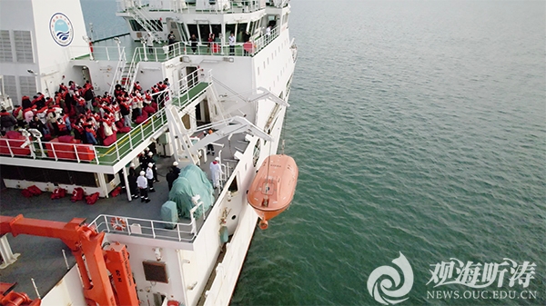 本站讯12月8日至9日,中国海洋大学研究生公共选修课“海洋科考认知实践”在“东方红3”船上继续开讲,副校长闫菊和70余名师生参加实践学习。 建设海洋强国是中国特色社会主义事业的重要组成部分,是中国海洋大学“为党育人、为国育才”的永恒追求。为了创新课程思政形式、打造海大特色的思政课程体系、培育具有“海味儿”的创新人才,学校连续多年在海洋强国建设的“国之重器”——“东方红3”船上开设“海洋科考认知实践”,面向全校所有专业研究生开放,内容包括参观“东方红3”船、开展安全教育和应急演习、学习海洋调查基本知识和海洋多学科常规要素观测方法、观摩海洋调查仪器设备实操、聆听校领导和思政老师讲授思政报告等,每期“海洋科考认知实践”为期两天。 8日上午,全体师生在奥帆中心码头登上“东方红3”船后举行了简短而又隆重的起航仪式。伴着一声汽笛,船舶驶往大公岛海域,师生观看离泊和航行全过程,实地观察并体验沿途海洋环境的状况。 观看“东方红3”宣传片,参观驾驶室、生活区和实验区,参与弃船求生演习,师生深入了解“东方红3”船,领略全球最先进的静音绿色科考实习船的风采;实验室老师从海洋水文、海洋气象、海洋生物、海