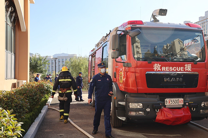• 本站讯校园属人员高度聚集的公共场所,消防安全历来是学校安全的重中之重。为有效增强师生员工消防安全意识和自防自救能力,保障校园平安,中国海洋大学于11月9日全国消防日,在崂山校区工程训练中心组织开展消防应急疏散演练活动,150余名师生员工参加了演练活动。崂山区世园消防救援中队消防员现场指导。保卫处提前与世园消防救援中队对接,确定演练内容,细化演练方案,安排部署各条疏散路线及疏散引导人员,告知注意事项,确保消防演练安全有序进行。11月9日上午9时40分,随着警报声响起,参与演练的师生员工在安保人员的引导下,根据疏散标志指引,从工程训练中心各楼层选择就近逃生路线,快速有序地撤离到室外安全区域。师生员工安全撤离到安全区域后,安保人员清点人数,在确保安全后组织大家在工程训练中心南侧平台上观摩消防车入场灭火。世园消防救援中队消防车拉响警报沿消防车道进入指定地点,消防员升起钢梯、连接水枪,开始对指定“起火点”进行喷射,灭火组人员寻找到室外消火栓,连接水带协助消防车共同“灭火”。穿戴防护服、自持式呼吸器的消防员,携带便携式灭火器和破拆工具等装备冲进楼内,将楼顶被困人员救出“火场”。世园消防救援中队消防