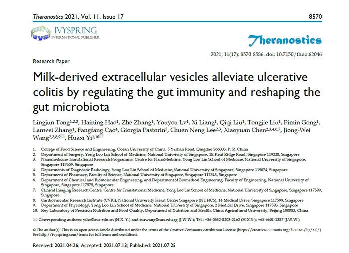 本站讯日前,中国海洋大学食品科学与工程学院易华西教授团队与新加坡国立大学王炯伟教授团队合作,在生物医学领域知名杂志《Theranostics》上发表题为“Milk-derived extracellular vesicles alleviate ulcerative colitisby regulating the gut immunity and reshaping the gut microbiota”的研究论文。易华西教授和新加坡国立大学王炯伟教授为文章共同通讯作者,CSC联合培养博士研究生仝令君为文章第一作者,中国海洋大学为第一通讯单位。炎症性肠病(IBD)是全球性的健康问题,常伴随着肠道免疫稳态紊乱以及肠道菌群失调。免疫抑制药物是目前IBD的主要治疗方法,但药物治疗过程中可能引起骨髓抑制、便秘、嗜睡等副作用,对宿主肠道菌群也有一定的负面影响。目前没有理想的IBD治疗药物。基于调节肠道免疫和靶向肠道菌群的特殊膳食补充剂是目前预防、缓解或治疗IBD的研究热点。本研究报道了牛乳来源的天然纳米细胞外囊泡(mEVs)对结肠炎症的缓解和保护作用,揭示了其通过调节宿主肠道免疫稳态和肠道微生