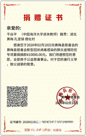 2月18日从湖北省黄梅县慈善会获悉,中共党员、中国海洋大学退休教授干焱平同志通过黄梅县慈善会,捐款1万元人民币,支援当地疫情防控工作。