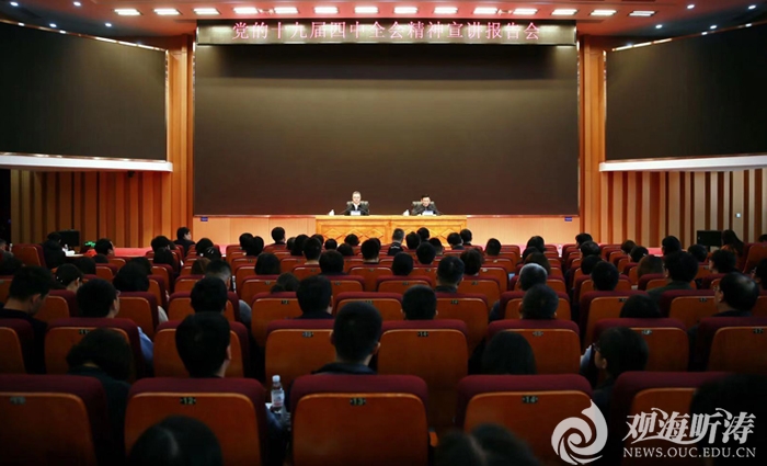 11月28日下午,中国海洋大学党委书记田辉在中国海洋大学崂山校区海洋科技楼国际报告厅,以《开创“中国之治”新境界》为题,向学校师生宣讲党的十九届四中全会精神。校党委宣传部部长陈鷟主持宣讲会。 田辉在宣讲时说,党的十九届四中全会是党站在“两个一百年”奋斗目标历史交汇点上召开的一次十分重要的会议,是在新中国成立70周年之际、我国处于中华民族伟大复兴关键时期召开的一次具有开创性、里程碑意义的会议。全会通过的《中共中央关于坚持和完善中国特色社会主义制度、推进国家治理体系和治理能力现代化若干重大问题的决定》》(以下简称《决定》),全面贯彻习近平新时代中国特色社会主义思想,充分体现党的十九大精神,深入回答了在我国国家制度和国家治理体系上“坚持和巩固什么、完善和发展什么”这个重大政治问题。习近平总书记在全会上的重要讲话,为坚持和完善中国特色社会主义制度、推进国家治理体系和治理能力现代化提供了科学指南和根本遵循。 田辉重点从“充分认识坚持和完善中国特色社会主义制度、推进国家治理体系和治理能力现代化的重大意义”“深刻领会中国特色社会主义制度和国家治理体系的显著优势,坚定中国特色社会主义制度自信
