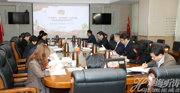 11月8日,中国海洋大学“不忘初心、牢记使命”主题教育学校领导班子第五次集体学习在崂山校区举行。按照“不忘初心、牢记使命”主题教育实施方案安排,学校领导班子集体学习《习近平关于“不忘初心、牢记使命”论述摘编》中“坚持以人民为中心,把群众观点和群众路线深深根植于思想中、具体落实到行动上”“坚决整治形式主义、官僚主义,加强真抓实干的作风建设”和“新时代要有新气象,更要有新作为”部分。党委书记田辉、校长于志刚、党委常务副书记张静、副校长李巍然、副校长闫菊、总会计师王剑敏,党委常委、校长助理吴强明,校长助理于利以及党委理论学习中心组其他成员参加学习。田辉主持会议。 集体学习研讨中,田辉强调,牢记党的宗旨性质,改进工作作风,勇于担当作为,是每位共产党员加强党性修养的重要内容,也是永恒的话题。他要求,我们要时刻把党的宗旨性质记在心中,努力践行全心全意为人民服务的宗旨,着力抓好主题教育整改落实工作,努力解决师生反映的学习工作中最关心最直接最现实的问题。田辉指出,“新时代要有新气象,更要有新作为”是习近平总书记对全党全国各族人民创造新业绩、书写新辉煌的鼓舞和动员。学校目前处于一流大学建设的关键