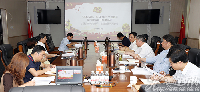 本站讯9月25日,中国海洋大学“不忘初心、牢记使命”主题教育学校领导班子第三次集体学习在崂山校区举行。按照中国海洋大学“不忘初心、牢记使命”主题教育实施方案安排,学校领导班子以“加强党的政治建设,推进全面从严治党”为主题,集中学习研讨《习近平关于“不忘初心、牢记使命”论述摘编》和《关于新形势下党内政治生活的若干准则》。党委书记田辉,校长于志刚,党委常务副书记张静,副校长李巍然,总会计师王剑敏,党委常委、校长助理吴强明,校长助理于利以及党委理论学习中心组其他成员参加学习。田辉主持会议。 田辉指出,党的十八大以来,以习近平同志为核心的党中央在领导全面从严治党的实践中,形成了习近平党建思想,深化了新形势下对党的建设规律的认识,开辟了马克思主义党建理论新境界。习近平党建思想是习近平新时代中国特色社会主义思想的重要组成部分,是新时代全面加强党的领导和党的建设的根本遵循和行动指南,我们要深入学习领会习近平总书记党建思想,贯彻落实新时代党的建设总要求,不断提高党的建设质量。 田辉强调,党的政治建设是党的根本性建设。党员领导干部要旗帜鲜明讲政治,树牢“四个意识”,坚定“四个自信”,坚决做到“两个维