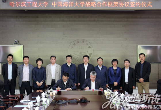 中国海洋大学校长于志刚(前排右)、哈尔滨工程大学校长姚郁(前排左)分别代表两校签署战略合作框架协议本站讯5月3日上午,中国海洋大学与哈尔滨工程大学战略合作框架协议签署仪式在崂山校区图书馆第一会议室举行。中国海洋大学校长于志刚、哈尔滨工程大学校长姚郁分别代表两校签署战略合作框架协议。党委副书记、副校长陈锐主持仪式。哈尔滨工程大学党委副书记夏桂华,学校党委常委、党委办公室主任、校长办公室主任吴强明出席仪式。 于志刚校长代表学校欢迎姚郁校长一行。他指出,中国海洋大学和哈尔滨工程大学都以海洋事业为舞台,有着共同的事业追求,在各自发展定位、主体学科专业、优势与基础、资源与平台等方面互补性强。双方应按照战略合作框架协议逐项落实合作内容,在人才培养、科学研究、新校区规划与建设等领域开展长期、深入合作,实现优势互补、错位发展,为服务海洋强国建设、创新驱动发展作出应有贡献。 姚郁校长谈到,中国海洋大学的海洋特色给他留下深刻印象,在学科建设、创新人才培养和历史文化传承等方面的经验值得哈尔滨工程大学借鉴。哈尔滨工程大学正在规划建设的青岛校区毗邻中国海洋大学海洋科教创新园区(黄岛校区),为双方加强合作提供