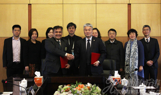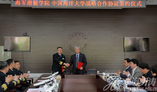 中国海洋大学校长于志刚(右)、海军潜艇学院院长王宇分别代表两校签署战略合作协议本站讯4月12日下午,中国海洋大学与海军潜艇学院战略合作协议签署仪式在崂山校区图书馆第一会议室举行。校长于志刚、海军潜艇学院院长王宇分别代表两校签署战略合作协议。根据协议,双方将在师资队伍、人才培养、重点专业、资源共享、科学研究等领域开展合作,并通过一系列合作机制确保双方务实合作,取得实效。 中国海洋大学党政领导张静、李巍然、王剑敏、卢光志、陈锐,党委常委丁林、吴强明,海军潜艇学院党委常委黄文斌、毕庶晶、贾涛、汤志宏、董光秀、朱力、郭星卫出席仪式。副校长李巍然主持仪式。 于志刚校长在讲话中指出,在第68个海军节即将到来之际,双方签署战略合作协议,标志着两校战略合作进入新阶段。要从服务海洋强国建设、创新驱动发展、“一带一路”建设等国家战略需求的高度认识合作,科学谋划,精心组织,力争实效。在军地人才培养方面,抓住师资队伍共育和重点专业共建两个重点,培养一批教学骨干和学科带头人,联合开展课程建设、课程开放共享、教学改革互通共研等,协同建设优势特色专业,在教学、管理、环境、文化和学术等各个领域推动融合发展,实现人