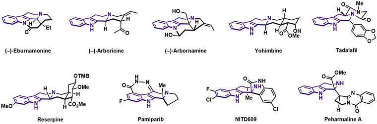本站讯近日,中国海洋大学医药学院、海洋药物教育部重点实验室、青岛海洋科技中心海洋药物与生物制品功能实验室王杨课题组在四氢-β-咔啉不对称催化合成及其在海洋天然产物全合成的应用领域取得重要进展,相关成果以“Catalytic enantioselective nitrone cycloadditions enabling collective syntheses of indole alkaloids”(硝酮参与的对映选择性环化反应用于吲哚生物碱的集群式合成)为题在线发表于国际知名学术期刊Nature Communications(《自然·通讯》)。四氢-β-咔啉 (Tetrahydro-β-carboline, THβC) 是一类重要的含氮杂环化合物,广泛存在于天然产物和药物分子中,如利血平 (Reserpine)、育亨宾 (Yohimbine)和他达拉非(Tadalafil)等 (图1)。3,4-二氢-β-咔啉氧化物作为一类含有咔啉结构的硝酮化合物,在合成手性四氢-β-咔啉衍生物方面具有很大潜力,然而3,4-二氢-β-咔啉氧化物参与的不对称催化反应仍鲜见报道。图1. 含四氢-β-咔啉