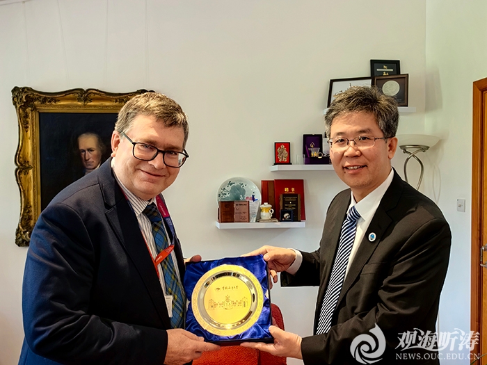 • 本站讯6月8日至14日,副校长范其伟应邀率团赴英国、爱尔兰,访问英国赫瑞-瓦特大学、朴次茅斯大学和爱尔兰科克大学,推进学校与英国、爱尔兰高校及机构的务实合作,并看望校友并举行校旗传递活动。范其伟副校长向Richard Williams校长赠送学校纪念品代表团访问赫瑞-瓦特大学,与校长Richard Williams、副校长兼教务长Steve McLaughlin等座谈交流。双方一致认为,两校在人才培养方面的合作成效显著,在第一批赴赫瑞-瓦特大学学习的83位海大中外合作办学项目学生中,有42位获得了一等学位,65位学生到英国帝国理工、伦敦大学学院、加州大学圣迭哥分校、爱丁堡大学等名校继续深造,充分体现了海大学生的高素质和双方合作的高质量,希望两校在博士生联合培养、项目合作研究等更多方面进一步拓展合作。代表团还深入赫瑞瓦特大学数学与计算机科学学院、工程与物理科学学院座谈交流并参观英国国家机器人中心,协商拓展在物理等专业领域的教学科研合作。代表团还看望了在赫瑞-瓦特大学学习的海大学生,了解学生在学习生活情况,征求大家对项目开展的意见和建议,并与学生们一起开展了庆祝学校建校100周年校旗全球传