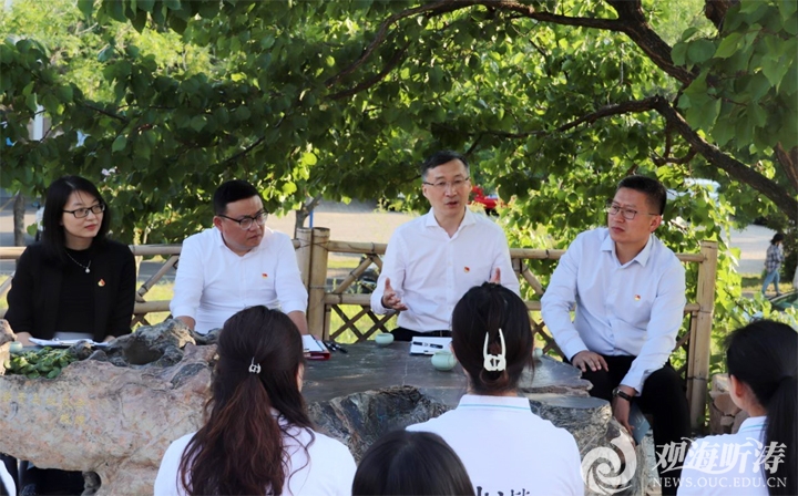 • 本站讯为深入学习贯彻习近平总书记对学校思政课建设的重要指示精神,充分发挥思政小课堂和社会大课堂的育人作用,5月28日下午,中国海洋大学红旗智援博士团党支部与绿春县委县直机关工委在崂山校区“慧生活”劳动教育基地百川杏坛联合举办“以‘大思政课’育时代新人 执‘青春之笔’绘美丽乡村”主题党日活动。红旗智援博士团党支部联系校领导、校长张峻峰,绿春县委常委、县委组织部部长、县委县直机关工委书记赵国辉,绿春县政府党组成员、副县长(挂职)高翔,管理学院旅游学系副主任刘佳参加活动,管理学院党委副书记乔宝刚主持活动。  张峻峰对红旗智援博士团扎根祖国大地、坚持知行合一的实践事迹给予充分认可。他指出,博士团开展的红色革命老区特色帮扶举措,为帮扶地乡村振兴做了贡献,引导青年学生涵养家国情怀、提升专业素养,是以“大思政课”拓展全方位育人新格局的有效探索。他强调,博士团应持续探索思政小课堂和社会大课堂融通实践育人模式,引领广大青年在深入一线的调查研究中了解国情民情、坚定理想信念,把论文写在祖国大地上,助力家国建设、养成硕学宏才。  赵国辉对学校选派到绿春挂职锻炼学生的工作表现给予充分肯定。他表示,绿春县与中国海