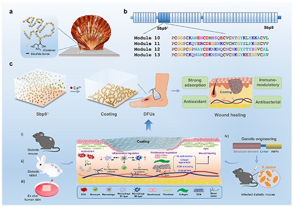 本站讯近日,中国海洋大学海洋生命学院海洋生物遗传与育种教育部重点实验室、方宗熙海洋生物进化与发育研究中心刘伟治团队在基于扇贝足丝粘附蛋白的仿生材料应用于难愈合创面修复领域取得重要新进展。研究论文“Extracellular Matrix-Mimetic Intrinsic Versatile Coating Derived from Marine Adhesive Protein Promotes Diabetic Wound Healing through Regulating the Microenvironment”(海洋粘附蛋白来源的类细胞外基质涂层通过调节微环境促进糖尿病足创面愈合)发表在材料学顶级期刊ACS Nano上,海洋生命学院博士生王露露、薛波为共同第一作者,刘伟治教授为唯一通讯作者,中国海洋大学为第一完成单位和通讯作者单位。糖尿病足溃疡(Diabetic foot ulcers, DFUs)是糖尿病严重并发症之一,作为典型的难愈合创面具有极高的患病率和致残率。创面持续渗出导致敷料降解,进而使50%的创面未得到有效护理,因此迫切需要开发兼具湿粘附性和功能性的敷料。研究