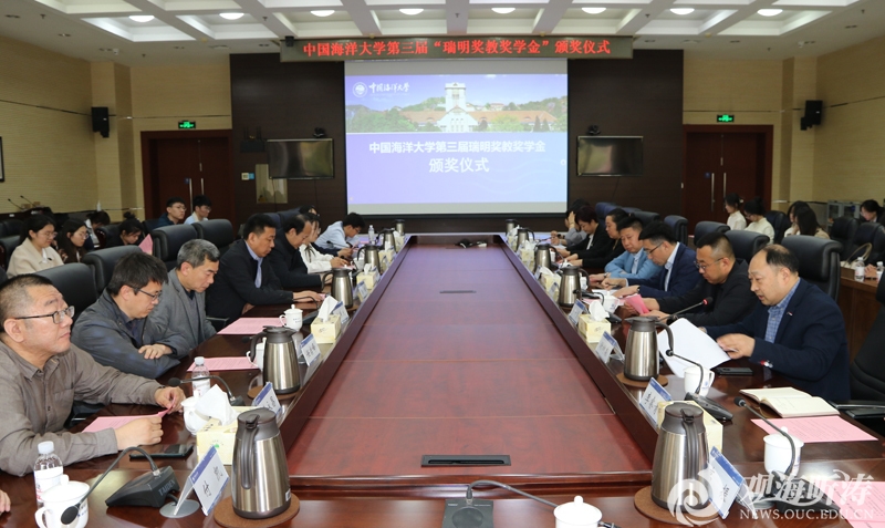 • 本站讯4月15日下午,中国海洋大学第三届“瑞明奖教奖学金”颁奖仪式在图书馆第一会议室举行。青岛瑞明医疗器械有限公司(以下简称青岛瑞明公司)总经理陈森,副总经理修仿勇,学校党委常委、党委办公室主任、校长办公室主任林旭升出席颁奖仪式。林旭升代表学校向青岛瑞明公司长期以来热心公益、关心教育的情怀表示感谢,对获奖师生表示祝贺。林旭升表示,加强基础研究,是实现高水平科技自立自强的迫切要求,是建设世界科技强国,海洋强国的必由之路。他希望各位教师继续勇挑时代重担,潜心教学科研,推动数学基础研究不断取得新发展新突破,希望各位学子坚定理想信念,常怀感恩之情、进取之心、刻苦钻研、学有所成,希望学院立足已有发展基础和良好发展态势,以创新为引领,推动各项事业高质量发展。陈森代表青岛瑞明公司向获奖师生表示祝贺。他希望各位老师继续秉持教育初心,以更加饱满的热情和更加专业的力量,培养出全面发展的社会主义建设者和接班人,为国家的教育事业贡献力量。他希望同学们心怀“国之大者”,坚定理想信念,珍惜青春时光,勤奋学习,努力成长为堪当民族复兴重任的时代新人。他表示,瑞明公司将持续关注国家教育事业,将重视人才作为社会责任,期待