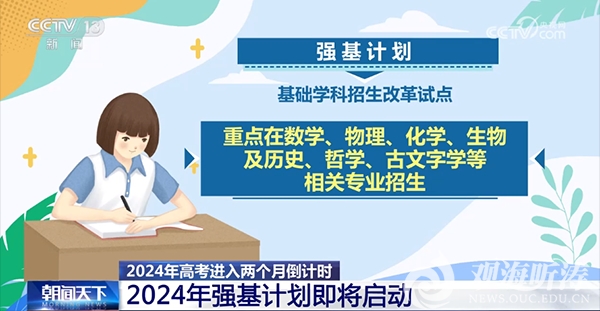 •   【编者按】4月8日,距离2024年高考还有两个月左右的时间,2024年强基计划也即将启动,试点高校共39所。强基计划又称基础学科招生改革试点,重点在数学、物理、化学、生物及历史、哲学、古文字学等相关专业招生,目的是选拔培养有志于服务国家重大战略需求且综合素质优秀或基础学科拔尖的学生。央视新闻频道(CCTV13)《朝闻天下》采访中国海洋大学本科生招生办公室主任王宇龙,谈强基计划人才培养特点。  记者:什么是强基计划?招生专业范围是什么?  王宇龙:强基计划是起始于2020年的特殊类型招生政策,是为了服务国家重大战略需求、加强拔尖创新人才选拔培养而开展的基础学科招生改革试点。强基计划突出基础学科的支撑引领作用,主要在数学、物理、化学、生物、力学、基础医学、育种及历史、哲学、古文字学等相关专业招生。同时,重点聚焦高端芯片与软件、智能科技、新材料、先进制造和国家安全,以及国家人才紧缺的人文社会科学领域。记者:主要招收什么样的考生?人才选拔标准是什么?王宇龙:强基计划指导思想和原则是服务国家重大战略需求,因此主要招收有志向、有兴趣、有天赋的青年学生进行专门培养,为国家重大战略领域输送后备人才