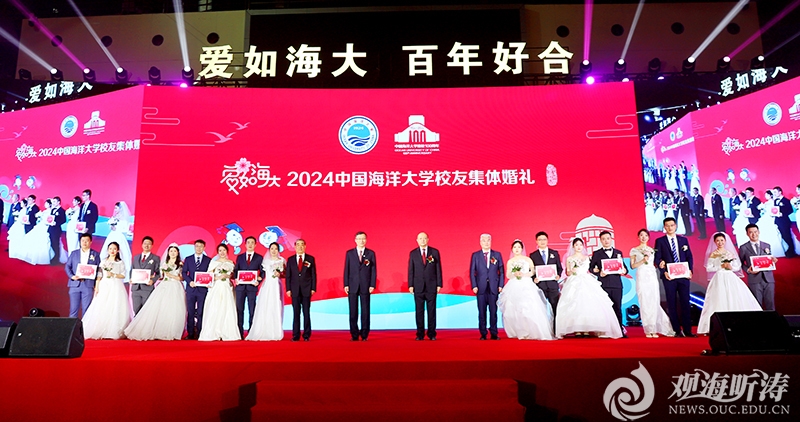 • 芬芳四月,如诗如画。在这美好的时节里,我们与阳光有约,与真情相伴。4月5日,“爱如海大”中国海洋大学2024校友集体婚礼在美丽的海大园隆重举行。100对校友新人重返校园,一起感受这浪漫而又神圣的瞬间,共同欢庆海大建校100周年。他们以爱为名,重聚山海之间,接受着来自师长同窗、学弟学妹们的深情祝福;他们以校为荣,奔赴精彩未来,传承着“海纳百川,取则行远”的校训精神。中国海洋大学校长张峻峰,原党委书记、校友会名誉会长冯瑞龙,原校长、校友会名誉会长吴德星,原校长、校友会会长于志刚出席典礼,并为新人们颁发纪念婚书。上午7时30分,伴随着悠扬的音乐,100对校友新人们身着盛装,手挽着手,走过红毯,在樱花大道、图书馆、凯旋广场、东区体育场上比肩而立,组成心形、“OUC”、“100”、“1924-2024”等造型,留下了自己爱的印记。他们漫步校园,让爱情之花尽情绽放;他们心牵母校,共祝海大100岁生日快乐。11时18分,校友新人们在2000余名观众的掌声祝福中款款步入婚礼现场。学校党委常务副书记、校友会常务副会长张静为100对新人主婚,她代表学校欢迎新人佳偶和亲友嘉宾们的到来。她说,曾经,你们来自天