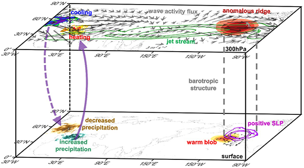 • 本站讯近日,中国海洋大学海洋与大气学院和深海圈层与地球系统前沿科学中心石剑副教授和黄菲教授联合国内外学者在中纬度海-气相互作用研究领域取得重要进展,首次从中纬度大气遥相关的视角,揭示了大西洋和地中海区域对触发东北太平洋暖斑北侧高压异常的远程贡献。相关成果以“Northeast Pacific warm blobs sustained via extratropical atmospheric teleconnections”(热带外大气遥相关促进了东北太平洋暖斑的维持)为题,发表于国际知名学术期刊Nature Communications。暖斑是发生于中纬度东北太平洋混合层的持续性异常增暖现象,在近十年尤为频繁。由于其对气候、生态环境和社会经济等方面均有重要影响,已引发了学界的广泛关注。冬季的暖斑事件与其上空大气环流的变化密切相关,已有研究揭示了暖斑北侧高压异常是触发冬季暖斑事件的关键系统,并进一步阐释了热带太平洋和北极地区激发该高压异常的物理过程。但是,中纬度地区对该高压异常的贡献尚不明确。暖斑是发生于中纬度东北太平洋混合层的持续性异常增暖现象,对于气候、生态环境和社会经济等方面具有