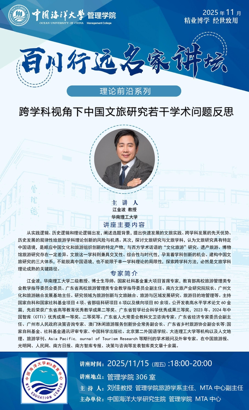 研究生百川讲坛第562讲-江金波:跨学科视角下中国文旅研究若干学术问题反思