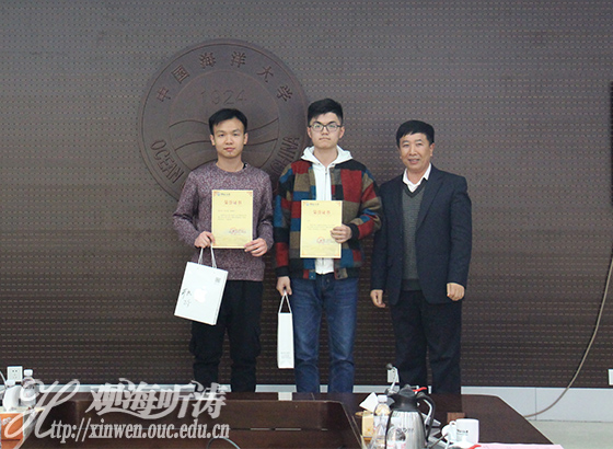 袁帅宇同学(左三)上台领奖 本站讯 为提高中国海洋大学学生培养水平,加强与其他兄弟院校