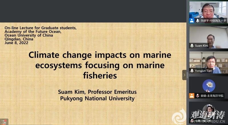 • 本站讯:6月8日下午,韩国科学技术研究院院士、韩国釜庆大学Suam Kim教授应邀做客“未来海洋讲坛”,作了题为“Climate change impacts on marine ecosystems focusing on marine fisheries(气候变化对海洋生态系统和海洋渔业的影响)”的线上学术报告,未来海洋学院院长李建平教授主持,百余位校内外师生聆听。Suam教授介绍了气候变化对于海洋生态系统和渔业生物的影响。气候变化从全球...