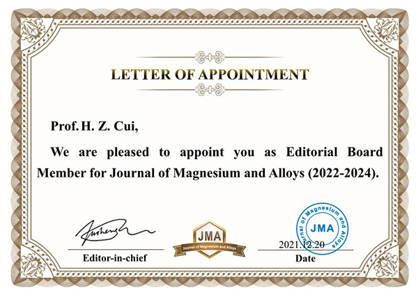 本站讯近日,中国海洋大学材料科学与工程学院崔洪芝教授当选为国际Elsevier期刊Journal of Magnesium and Alloys编委,期刊最新影响因子为10.088,为JCR 1区,中科院1区期刊。《Journal of Magnesium and Alloys》(简称JMA)是一本专注于镁及镁合金的国际学术期刊,由国家镁合金材料工程技术研究中心联合中国材料研究学会镁合金分会主办,潘复生院士任主编。期刊由科学出版社和著名出版...