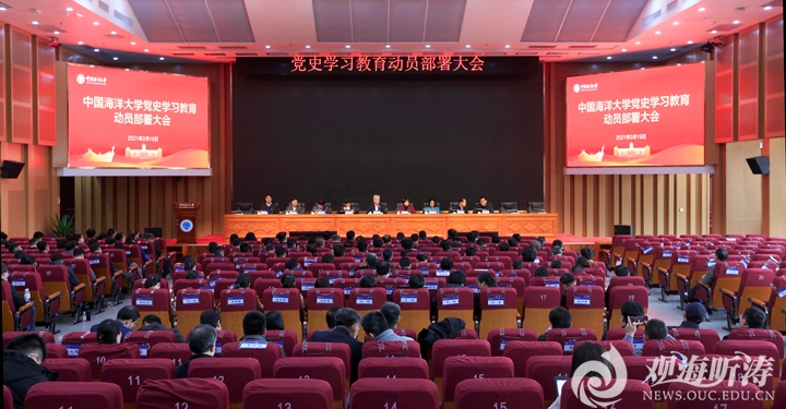 3月19日上午,中国海洋大学在崂山校区海洋科技楼国际报告厅召开党史学习教育动员部署大会。校长于志刚主持会议。党委书记田辉因在外学习,由党委常务副书记张静作党史学习教育动员部署。教育部党建工作联络员郑其绪,副校长闫菊,总会计师王剑敏,党委副书记卢光志,党委副书记、纪委书记杨茂椿,党委常委、校长助理吴强明,校长助理于利等出席会议。 于志刚在主持大会时指出,学习党史是坚持和发展中国特色社会主义、把党和国家各项事业继续推向前进的必修课,加强党的领导更是我们做好教育工作的根本保证,希望党员干部和广大师生共同努力,切实做好党史学习教育。一是要深化部署,统筹推进。坚持把党史学习教育与迎接中国共产党成立一百周年行动、“四史”学习教育等工作相贯通,与学校高质量谋划“十四五”事业发展、推进“双一流”建设等工作相融合,做到学史明理、学史增信、学史崇德、学史力行。二是要立足实际,突出特色。紧扣立德树人的初心使命,充分发掘总结学校在党史学习教育工作中的成功经验和特色做法。三是要压实责任,取得实效。把好政治关,把握正确导向,力戒形式主义,做到切合实际、生动有效。 张静在讲话中指出,在全党开展党史学习教育