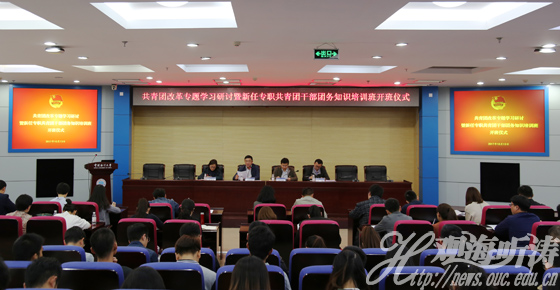校团委书记王雪鹏主持开班仪式。工程学院团委书记钟媛、海洋与大气学院团委干部陈宁作为专职团干部代表分别发言。学校全体专职团干部参加培训。
