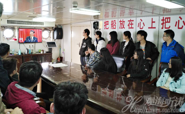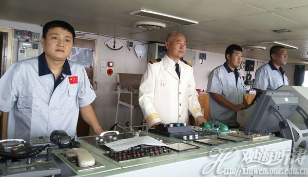 10月18日,中国海洋大学“东方红2”号海洋综合科学考察实习船正在西太平洋执行任务,虽然无法观看电视直播,但船员同志们利用网络微信等形式收听收看开幕会实况,并表示将用实际工作迎接党的十九大胜利召开。图为当日上午“东方红2”船船长张建平(左二)等坚守工作岗位。(图片来源:“东方红2”船)