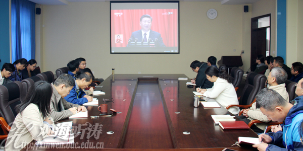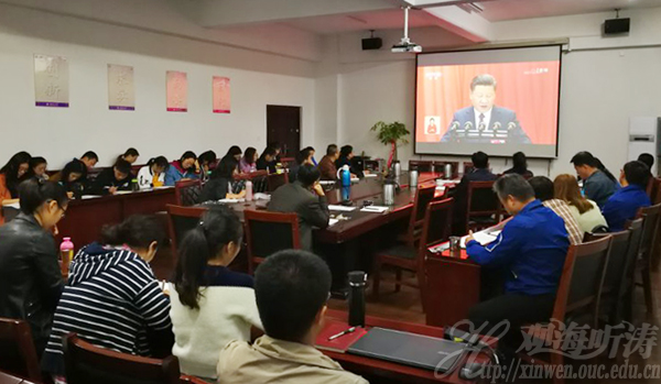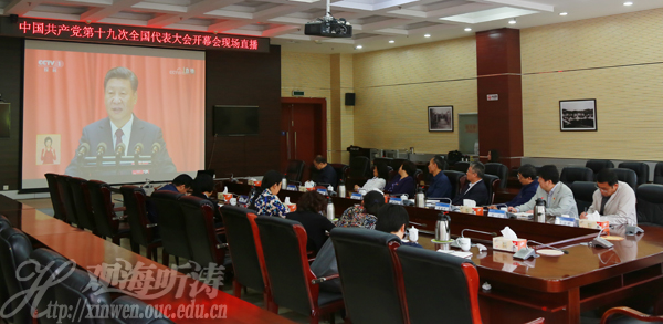 中国海洋大学党委理论学习中心组成员收看党的十九大开幕会实况(李华昌 摄)