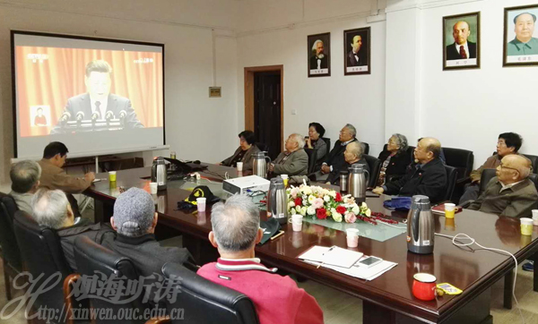 中国海洋大学离退休党委组织党员集体收看大会开幕会,学习十九大报告。(商允双 摄)