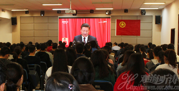 中国海洋大学团委组织团干部和学生会、研究生会、学生社联等学生组织在大学生活动中心收听收看了党的十九大开幕会。(刘萍 提供)