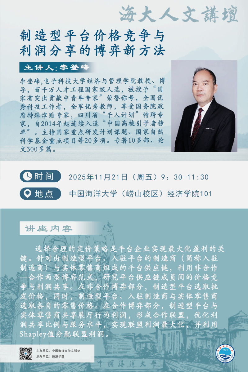 海大人文讲坛2025年第87讲-李登峰:制造型平台价格竞争与利润分享的博弈新方法