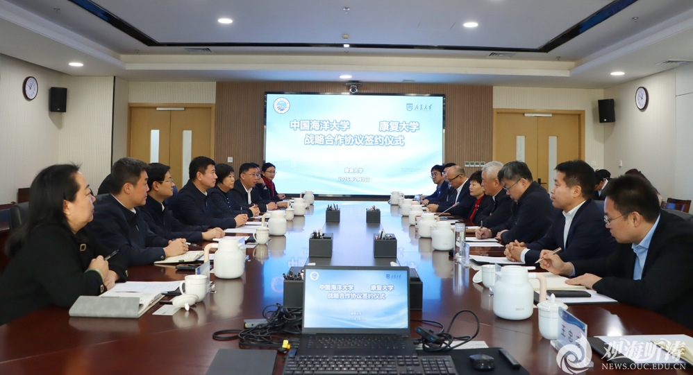 • 本站讯2月9日,中国海洋大学与康复大学战略合作协议签约仪式在康复大学举行。康复大学校长、中国工程院院士董尔丹主持仪式,党委书记刘军,分管日常工作的副校长姜宏,副校长毕建国、刘奇迹出席仪式。学校党委书记李明、党委常务副书记张静、副校长王雪鹏出席仪式。李明介绍了学校事业发展情况,对康复大学的建设发展成绩和蓬勃发展态势给予高度评价。他指出,中国海洋大学和康复大学同城为伴、关系密切,合作基础扎实、前景广阔。希望双方以习近平总书记重要讲话和重要指示批示精神为指引,以此次战略合作协议签订为契机,在人才培养、科学研究、服务社会、国际合作等方面加强资源共享与合作,主动融入和服务青岛现代海洋中心城市和“中国康湾”建设,共同为教育强国、海洋强国建设和齐鲁发展作出新的更大贡献。董尔丹对中国海洋大学的大力支持帮助表示感谢。他表示,中国海洋大学作为我国海洋科教领域的领军高校,具有深厚的历史底蕴和鲜明的办学特色,办学百余年来为国家教育事业、海洋事业作出突出贡献。中国海洋大学与康复大学同处青岛,交流合作密切、资源优势互补。希望双方围绕医工交叉、科技创新等领域深化合作,携手助力健康中国战略。王雪鹏、姜宏分别代表双方签