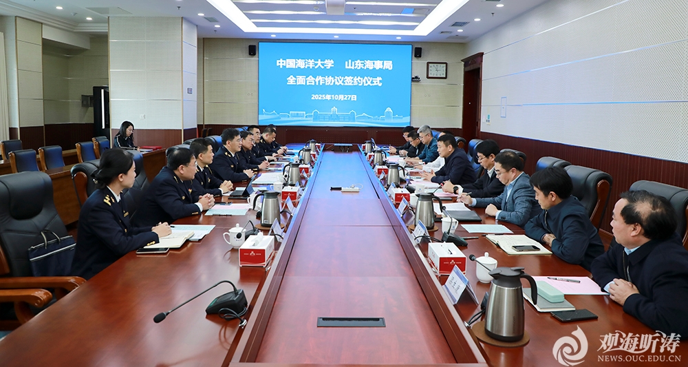 本站讯10月27日下午,中国海洋大学与山东海事局全面合作协议签约仪式在中国海洋大学崂山校区举行。山东海事局党委书记、局长马道玖,中国海洋大学党委书记李明出席仪式。李明对马道玖一行表示欢迎。他指出,中国海洋大学与山东海事局共同肩负服务海洋强国、海洋强省建设的重要使命,双方合作有着很好的基础、互补的优势、广阔的空间。此次签约恰逢党的二十届四中全会胜利召开、习近平书记给中国海洋大学全体师生重要回信一周年,标志着双方合作进入新阶段,是学校全面贯彻落实习近平总书记重要讲话和重要回信精神、贯彻落实党的二十届四中全会精神的积极举措。希望以签署合作协议和共建联合实验室为契机,进一步发挥双方优势,聚焦人才培养、海事监管、技术创新、文化传播等重点领域,拓展合作内容、创新合作方式,取得更多成果,共同为海洋强国、海洋强省建设作出新的更大贡献!马道玖回顾了山东海事局与中国海洋大学合作取得的丰硕成果,并感谢中国海洋大学为海事事业发展提供的强有力人才与技术支持。他表示,去年5月,习近平总书记在山东考察时强调“山东要打造世界级海洋港口群”,对交通海事提出殷切希望,为双方合作指明了方向。希望双方进一步强化政产学研用合作