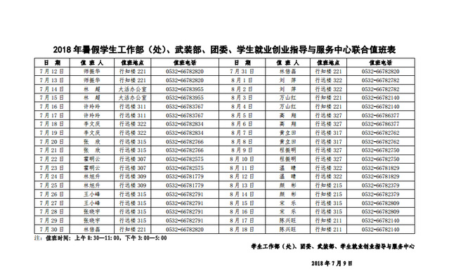 • 根据校历安排,7月12日-8月18日为暑假。学生工作部(处)、武装部有关工作安排如下:1.开通本科新生资助工作咨询热线,全天候为本科新生提供“绿色通道”、助学贷款等资助方面的咨询服务。热线电话0532-66782262,联系人:霍老师、边老师。2.开通2018年大学生征兵咨询热线,为本科新生、在校生和应届毕业生提供参军入伍的相关政策、工作安排等咨询服务。热线电话:0532-66781925,联系人:王老师。3.本科毕业生政审中学校学生工作部门意见的签署。联系电话:0532-66782791,联系人:张老师。学生工作部(处)、武装部2018年7月9日附:2018年暑假学生工作部(处)、武装部、团委、学生就业创业指导与服务中心联合值班表