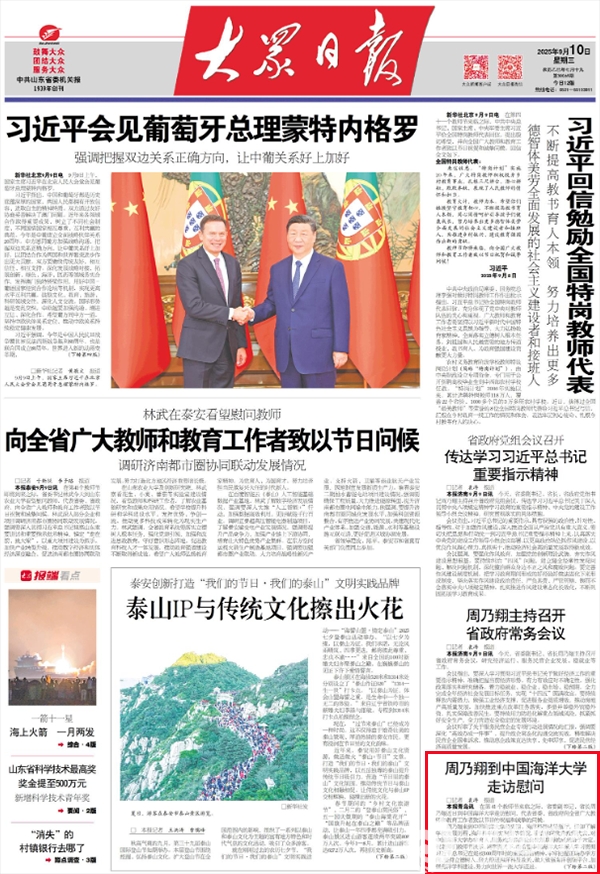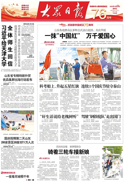 【编者按】家国同心,共庆华诞。在新中国成立76周年之际,《大众日报》联合山东16市党报推出“假日观察·省市党报联动”融媒报道。10月3日出版的《大众日报》头版,以“科考船上,升起五星红旗”为题,对中国海洋大学“东方红3”船工作人员立足岗位,扎实开展科学考察,以及举办升旗仪式等系列活动欢度国庆、祝福祖国的家国情怀进行了重点报道。2025年10月3日出版的《大众日报》头版 “我们在东海,祝新中国76周年生日快乐!”10月1日6时30分,太阳刚刚半跃出海面,正在东海执行科考任务的中国海洋大学“东方红3”船,全体科考队员及船员齐聚驾驶甲板,举行升国旗仪式,向中华人民共和国成立76周年送祝福,祝祖国繁荣昌盛,国泰民安。 “东方红3”船党支部书记王辉介绍,除了举行升国旗仪式,他们还组织党员重温入党誓词,举办爱国主义歌曲演唱比赛等活动,一起欢度国庆。 王辉说:“国庆之日,天公作美,晴空万里,只有2级海风和0.5米的轻浪,海况良好,适宜开展科考作业。” 自7月中旬“东方红3”船从青岛起航以来,王辉和同事们已经在海上航行了近80天,航迹遍布黄海、东海、南海,航程达9700余海里。这一航次,并非都