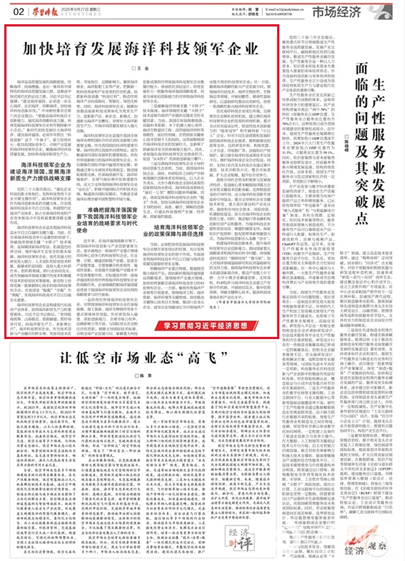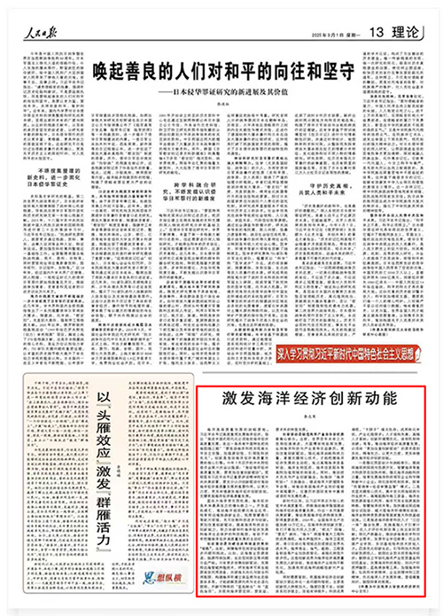 【编者按】习近平总书记强调,推进中国式现代化必须推动海洋经济高质量发展,走出一条具有中国特色的向海图强之路。近日,人民日报社主管、人民论坛杂志社主办的《国家治理》杂志在2025年第15期刊发了中国工程院院士、中国海洋大学海洋工程系教授、教育部高等学校海洋工程类专业教学指导委员会主任委员李华军教授撰写的题为《奋力开创海洋经济高质量发展新局面》的文章,阐述了以科技创新为引擎,以产业升级为路径,以制度创新为保障,以人才高地为支撑,以全球协作为视野,多领域、多维度协同聚力,推动海洋经济高质量发展的思考,现转发全文,以飨读者。 浩瀚深蓝,机遇与挑战交织。伴随全球对深远海资源开发、蓝色低碳转型、智慧海洋治理需求的空前高涨,海洋正成为大国战略竞合的新焦点。2024年,中国海洋经济生产总值突破10.5万亿元,占国内生产总值比重达7.8%,增速比国内生产总值高0.9个百分点,已跃升为高质量发展的重要引擎。与此同时,核心技术制约、产业结构不合理、复合型人才短缺、国际规则博弈加剧等挑战,亦日益凸显。推动海洋经济高质量发展,非单一领域突破可成,而是一项涉及科技创新、产业升级、人才培养、制度保障、全球协作的复