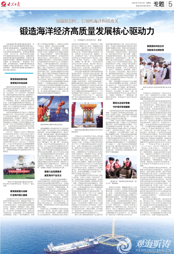 【编者按】在中国海洋大学迎来建校101周年之际,10月 27日出版的《光明日报》在教科新闻版以“胸怀蓝色梦想 培育时代新人”为题,对中国海洋大学涵养“海味”校园文化,以文化人、以文育人的创新与实践进行了重点报道。现转发全文,以飨读者。 “希望大家赓续一代代海大人的家国情怀,自觉把个人理想融入国家发展,把青春奋斗在祖国最需要的地方,努力成长为胸怀蓝色梦想、堪当时代重任的栋梁之材。”近日,中国海洋大学党委书记李明为4800余名本科新生讲课,勉励同学们弘扬海大精神、传承海大文化,为中国式现代化建设贡献青春力量。 凝望中国海洋大学这座百年学府,它特色鲜明的“海味”校园文化,滋养着一代代学子的心田,成为以文化人、以文育人的生动实践。 在中国海洋大学,有一门课程的授课师资可谓名师荟萃,那就是国内首门海洋类交叉研究生公共选修课——经略海洋。该课程由中国科学院院士吴立新领衔,20余位涉海文理工领域学术带头人联合授课,涵盖从海洋科学、海洋战略到海洋碳中和、海洋文明史、海洋国际法等诸多方向。 “这既是新时代海洋教学文理工农商大交叉课程模式的一次大胆尝试,也是学校推动思政课内涵式发展的有益探索。”未