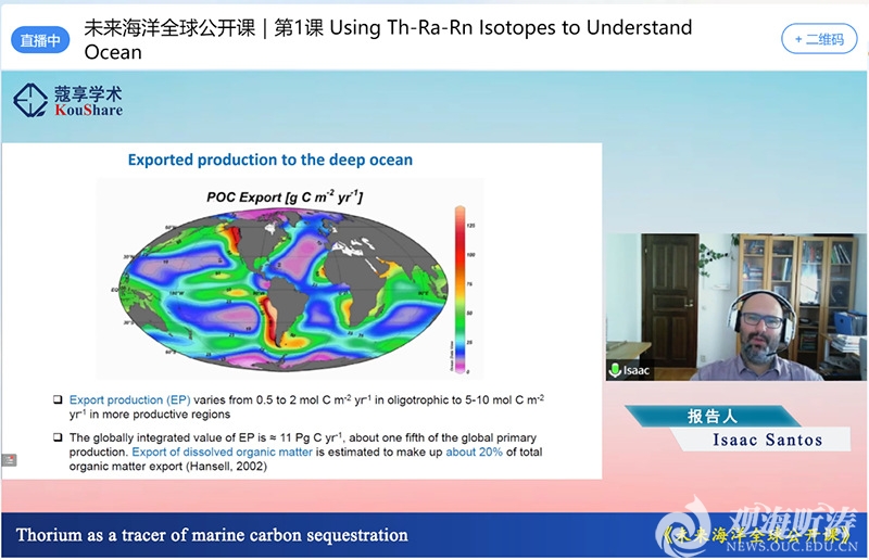 本站讯为贯彻习近平总书记关于海洋强国建设的重要论述和“海洋命运共同体”重要理念,中国海洋大学积极创新拔尖研究生培养和国际合作交流新范式,发挥未来海洋学院在国际化拔尖人才培养方面的优势,于7月20日开设国内首门“全球海洋公开课”,国际著名海洋化学专家、瑞典哥德堡大学Isaac Santos教授,与中国海洋大学未来海洋学院导师许博超教授联合讲授“Using Th-Ra-Rn Isotopes to Understand Ocean”(利用钍-镭-氡同位素理解海洋)。中国海洋大学副校长刘勇出席开课仪式并致辞,未来海洋学院院长李建平主持开课仪式。刘勇在致辞中指出,中国海洋大学作为国家重点建设的唯一一所综合性海洋大学,肩负着贯彻落实“海洋命运共同体”理念的重要使命。学校自2022年1月起,决定由未来海洋学院设计全球海洋科学公开课,希望此举能进一步推动海洋创新拔尖人才培养的国际化。他强调,中国海洋大学将坚定的、长期的贯彻落实“海洋命运共同体”理念,学校将持续提升人才培养理念和模式,持续扩大对全世界的开放共享,以“全球海洋公开课”为新起点,努力建设更加开放、更有活力、更有担当的世界一流大学。Isaa
