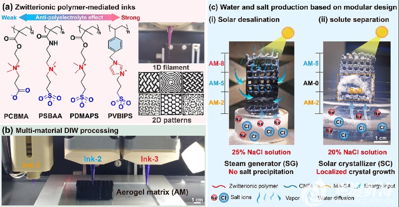 本站讯近日,材料科学与工程学院高分子材料与工程系徐晓峰教授课题组在国际顶尖材料期刊《先进材料》(Advanced Materials,IF:26.8)发表了题为“Tailor-Made Solar Desalination and Salt Harvesting from Diverse Saline Water Enabled by Multi-Material Printing”的研究成果。全球淡水资源短缺的问题日益严峻,严重威胁着人类社会的可持续发展。近年来,新兴的太阳能驱动的界面蒸发技术因可持续、低能耗等优点备受关注,在高浓度盐水淡化与资源化领域展现出独特优势。然而,传统光热复合材料如气凝胶、水凝胶和泡沫的各向同性结构限制了光热性能优化和多功能集成应用。增材智造(3D打印)是制备精细结构材料的有效方法,但现有的3D打印技术所制备的光热复合材料存在孔隙结构单一、能量损失、传质阻力和盐结晶调控困难等问题,难以在高盐环境中实现稳定海水淡化与资源化应用。本课题通过多材料墨水直写技术(DIW),能在指定的空间位置精确沉积不同的光热墨水,成功构建了具有梯度结构的3D光热矩阵。通过协同优化墨