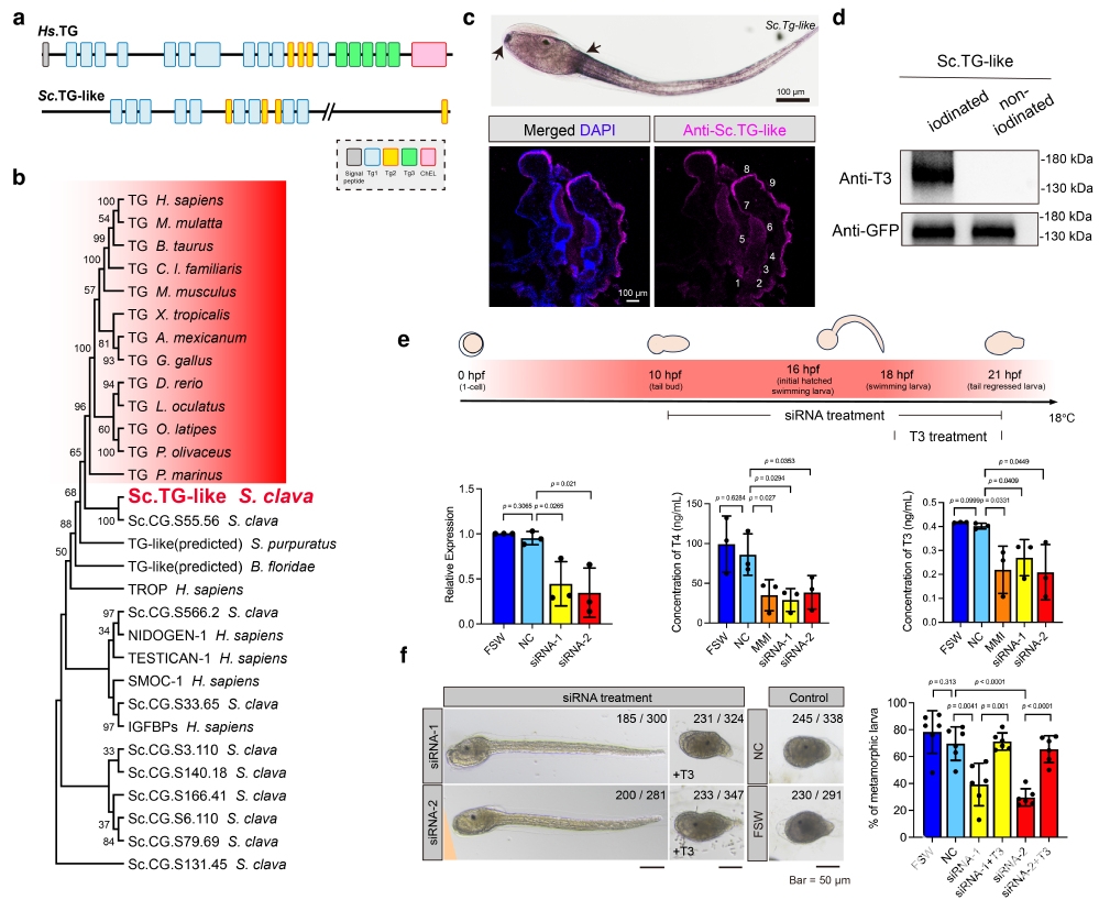 • 本站讯2月7日,中国海洋大学方宗熙海洋生物进化与发育研究中心董波教授团队在国际知名学术期刊Nature Communications(《自然·通讯》)上发表了题为“Identification of protein precursor for thyroidhormone synthesis in basal chordate ascidian Styela clava”(甲状腺激素合成前体蛋白在脊索动物柄海鞘中的鉴定)的研究论文。该研究首次在无脊椎动物中鉴定并功能验证了甲状腺激素合成所必需的前体蛋白—类甲状腺球蛋白(TG-like),为揭示甲状腺内分泌系统的起源与演化提供了重要科学依据。甲状腺激素在动物的生长发育、代谢调控以及生命周期转换过程中发挥着核心调控作用。在脊椎动物中,TH的合成机制已被系统阐明,其中甲状腺球蛋白(Thyroglobulin,TG)作为激素合成的前体蛋白,为甲状腺激素的生成提供关键的酪氨酸残基,是该过程的核心分子。然而,尽管在多种无脊椎动物中已检测到甲状腺激素,并证实其在发育和变态过程中的重要功能,但是参与甲状腺激素合成的关键前体蛋白始终未被鉴定,这一缺失长期