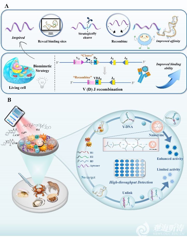 • 近日,中国海洋大学食品科学与工程学院毛相朝教授团队在Cell Press细胞出版社旗下Trends in Biotechnology(《生物技术趋势》)发表题为“An Immune-inspired Intelligent Aptasensor with Broad Detection Capability”(一种具有广泛检测能力的免疫启发式智能适配体传感器)的研究论文。该研究借鉴生命系统的运作机制,提出了一种创新的仿生策略,对适配体进行工程化改造,组装了由靶标结合触发的高催化活性纳米酶,构建出一种纳米酶联合适配体的生物传感器,辅以智能手机数据传导技术,可广泛应用于海洋食品中多种靶标的快速、智能检测,从而突破了酶联适配体传感器在食品分析检测领域实际应用受限的瓶颈难题,推动了适配体识别、纳米酶催化转导技术的发展及其在食品生物传感分析检测领域的应用。近年来,生物传感器(Biosensors)在食品分析检测领域展现出不可或缺的价值,其中,适配体传感器(Aptasensors)备受关注,成为近年来的研究热点。适配体通过指数富集配体系统进化(SELEX)获得,具有特异性、可编程性等优势,可与酶催